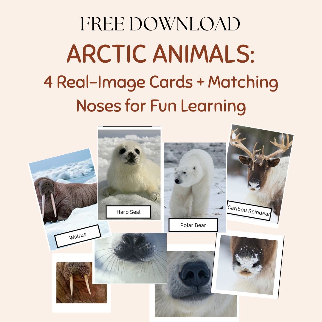 🦊 4 Real-Image Flashcards: Featuring vibrant, real-life photos of Arctic animals like the polar bear, harp seal, and walrus. These Montessori-inspired cards help children connect visually with the animals, making learning more meaningful.
