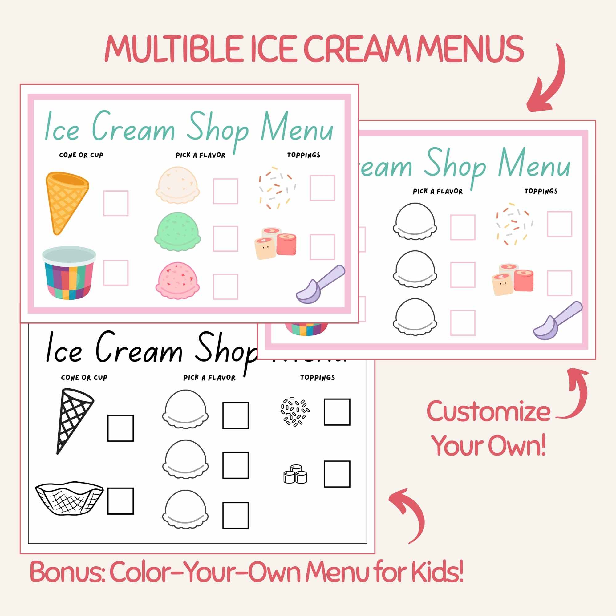 ✅ Personalized Experience – Includes 4 editable ice cream shop menus to customize flavors + 1 black & white menu so kids can color in their own choices.